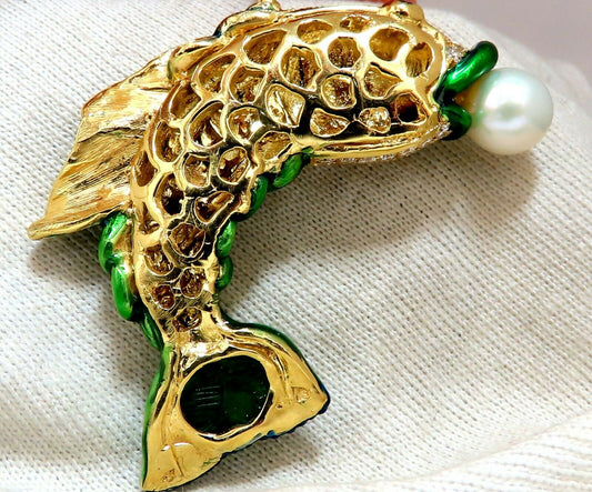Natural Akoya Pearl Sapphire Emerald & Diamonds Enamel Fish Pendant 18kt