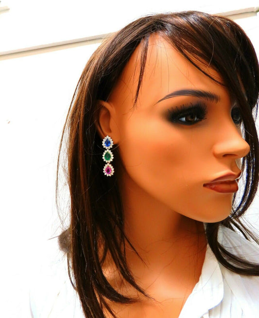 13.24ct Natural Emeralds & Sapphires Three Tier Dangle Earrings 18 Karat Pears