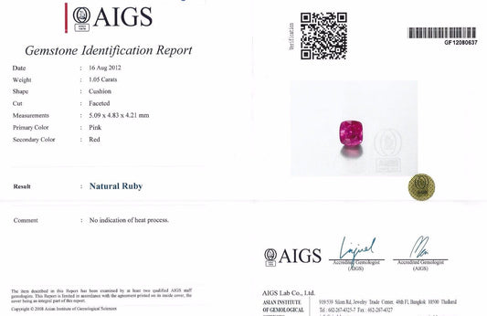 AIGS Certified 1.45ct natural no heat pink red ruby diamond ring 18kt unheated