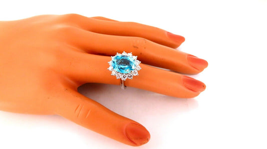 7.22ct natural blue zircon diamonds cluster cocktail Halo ring 18kt gold