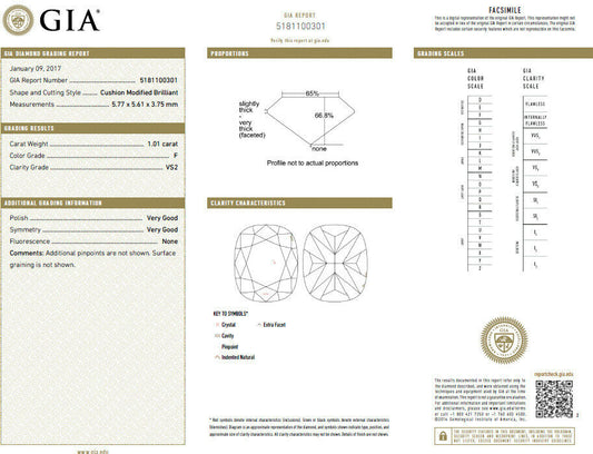 GIA Certified 1.01ct. Cushion cut diamond ring Platinum F/VS