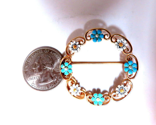 Vintage Estate Handmade Enamel White Blue Daisy Circle Pin 14kt 11791