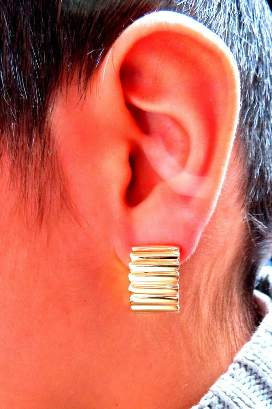 18Kt Gold Staggard Row Pattern Earrings 3D Semi Hoop Clips Post-Less