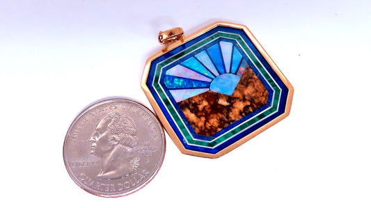 Rising Sun Pietra Dura Inlay Opal Malachite Lapis Pendant 14kt Gold