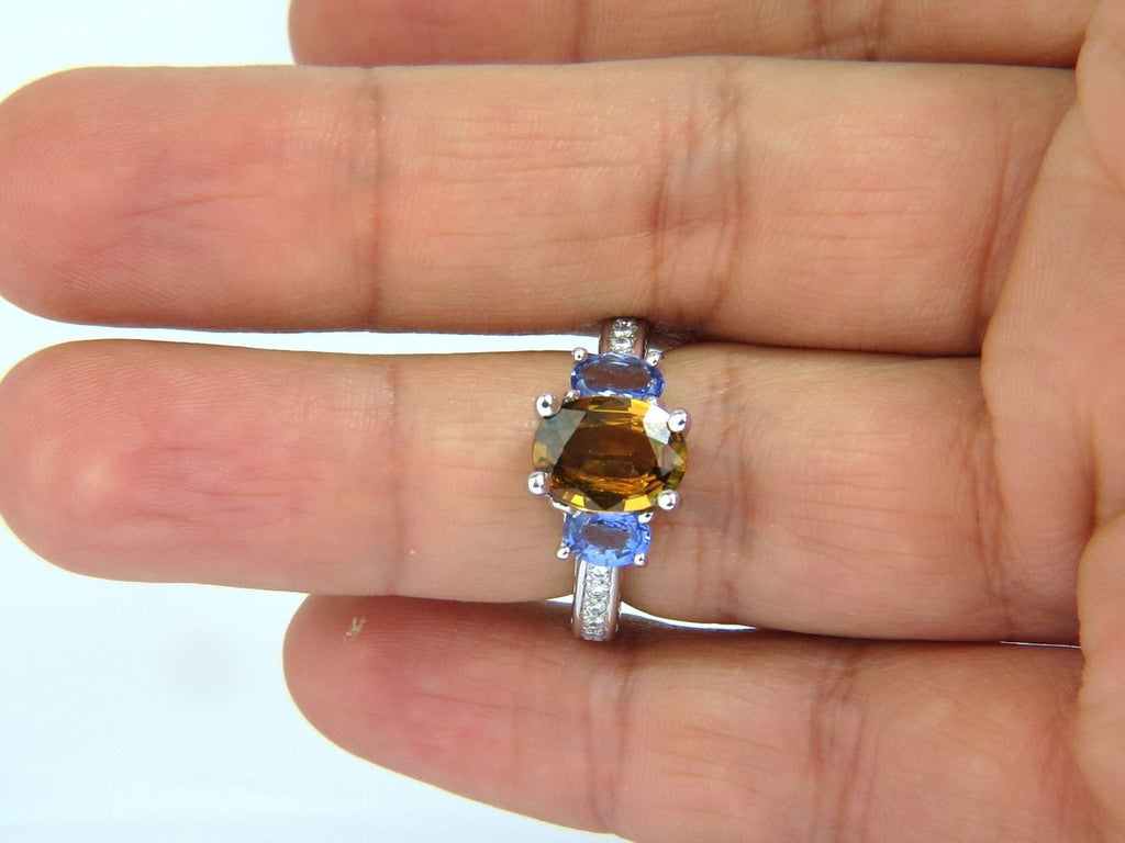 2.28ct Natural Sapphire & Tanzanite ring. Sapphire of beautiful Fancy Vivid Yellow Brown. VS- Clean Clarity 10.4 X 7.6mm Vibrant Saturation Fully Faceted Oval Shape for maximum brilliance Clean Clarity and transparent .90ct. Natural (2) tanzanites Oval, full cut brilliant clean clarity and transparent. Vivid Violetish Blue. .50ct. Round, Full cut diamonds. G color Vs-2 clarity. Full cuts. 14kt. White gold. 6.5 Grams. Appraisal to accompany $4,500