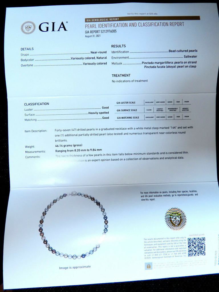 GIA certified Natural Multicolor Tahitian Saltwater Pearls necklace 9m 14k